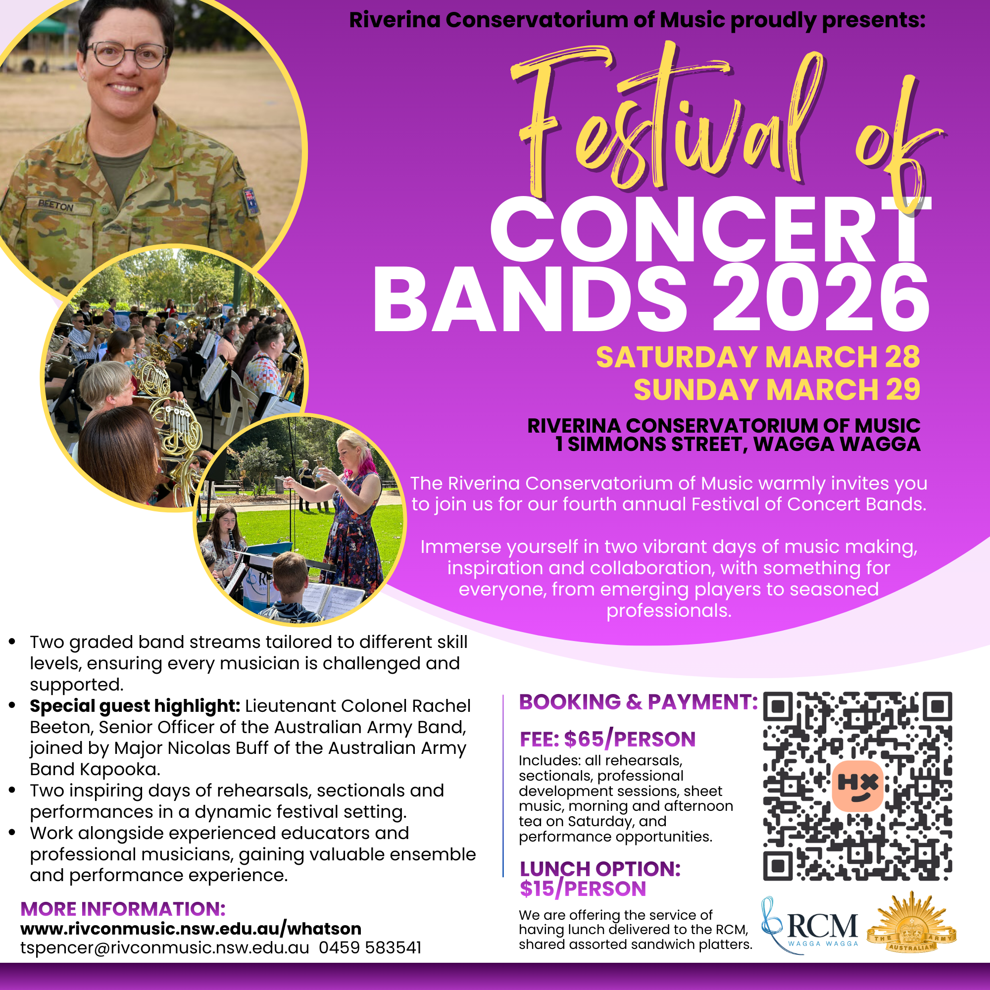 The Riverina Conservatorium of Music is excited to invite you to our fourth annual Festival of Concert Bands! Over three days, enjoy a variety of musical activities designed for all skill levels—from beginners to seasoned professionals. The festival features three band streams, ensuring every participant has an engaging and rewarding experience.